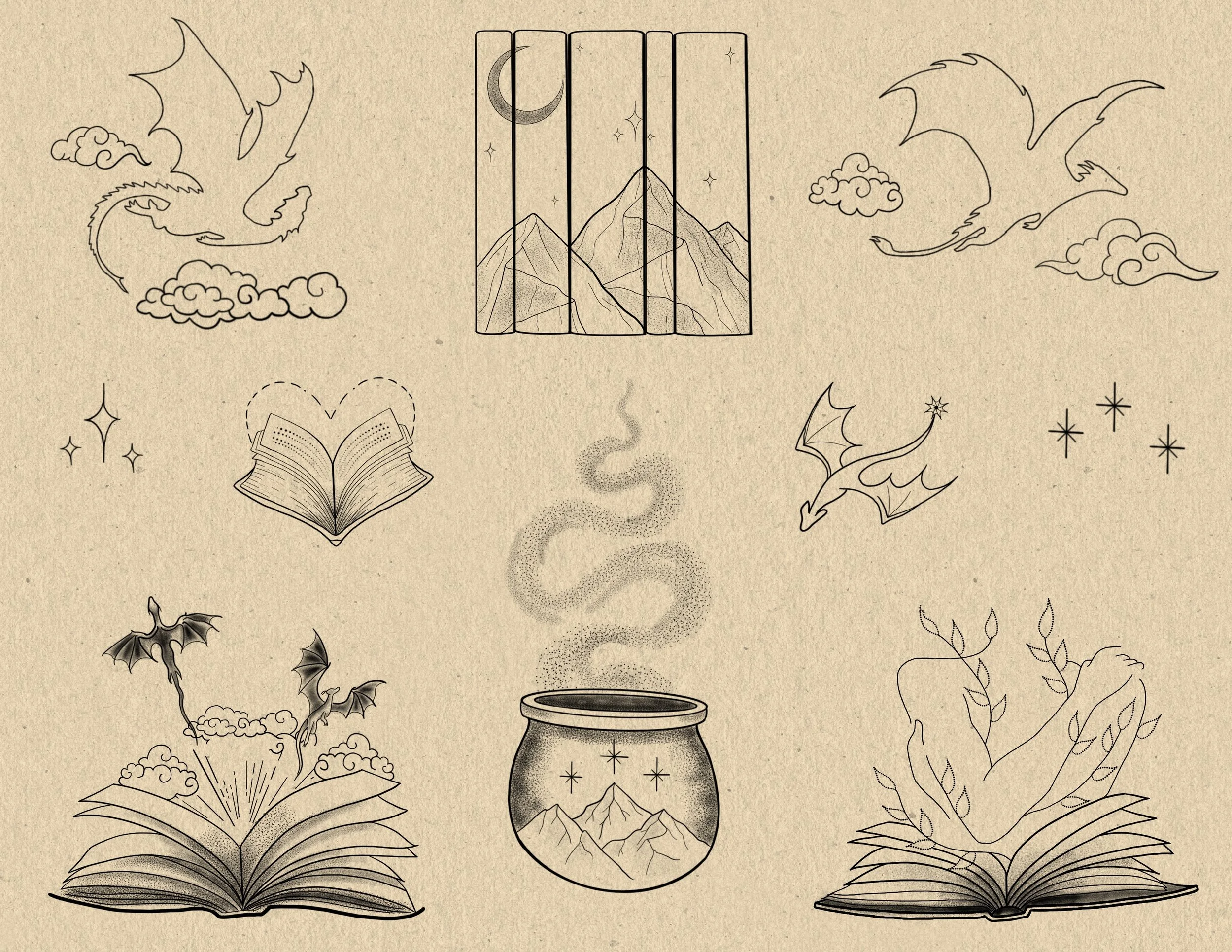 These flash pieces within this series will max out around 4-5” in size and must be tattooed on arms, legs or shoulders only.